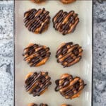 Step 4: Remove from oven and top each one by press remaining pretzels into the melting Rolo’s, creating the cookie tops. If not drizzling optional chocolate, place in freezer for a few minutes to allow cookies to firm up.