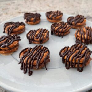 - Remove from oven and top each one by press remaining pretzels into the melting Rolo’s, creating the cookie tops. If not drizzling optional chocolate, place in freezer for a few minutes to allow cookies to firm up.