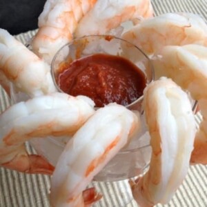 Most of the time to keep things quick and easy, I just thaw and drain already cooked peeled shrimp when making shrimp cocktail, so all I need to do is arrange them on a platter and make a simple cocktail sauce.