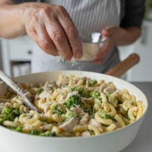 - Add the drained pasta and broccoli to the skillet along with the grated cheese, salt, and pepper. Toss well to combine.