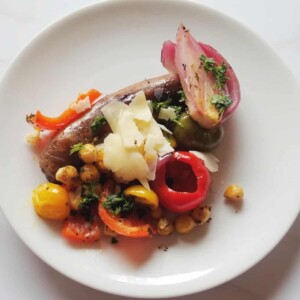 This sheet pan version captures the same Italian sausage and roasted vegetable spirit, with a lemony herb vinaigrette that ties everything together in the oven. Cherry tomatoes, chickpeas, red onion, and bell pepper roast alongside the sausage links and come out caramelized and fragrant.